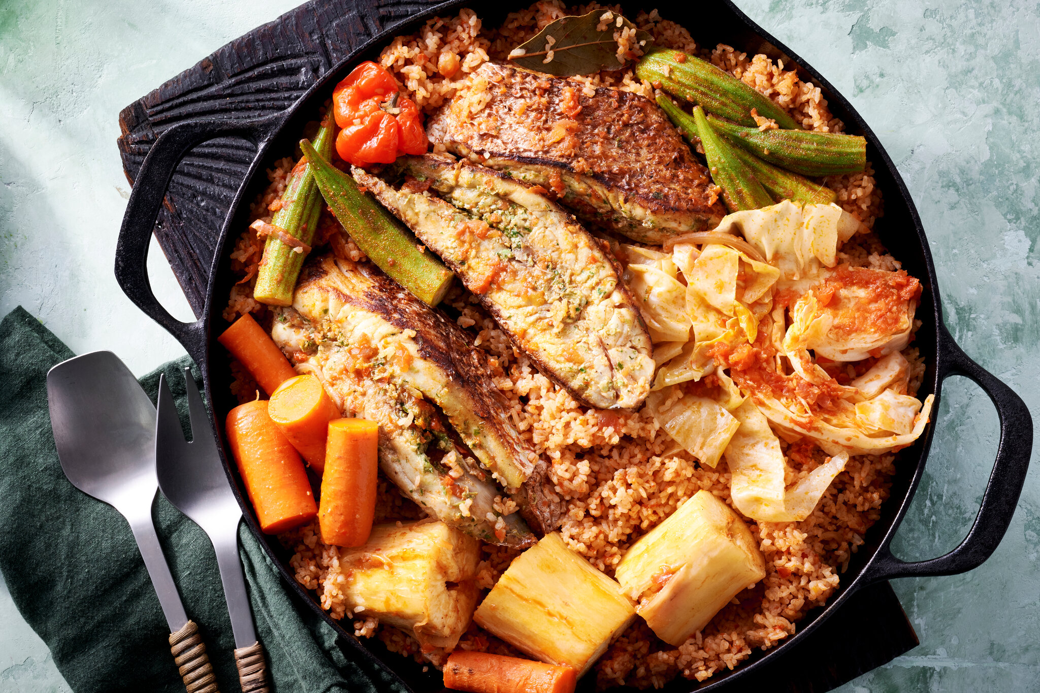 El nombre significa literalmente “arroz con pescado” en wolof, y su preparación puede variar ligeramente de una familia a otra. Lo más especial de este plato es su presentación: se sirve en una gran fuente común, ideal para compartir entre varias personas, lo que representa el espíritu comunitario de la gastronomía africana.